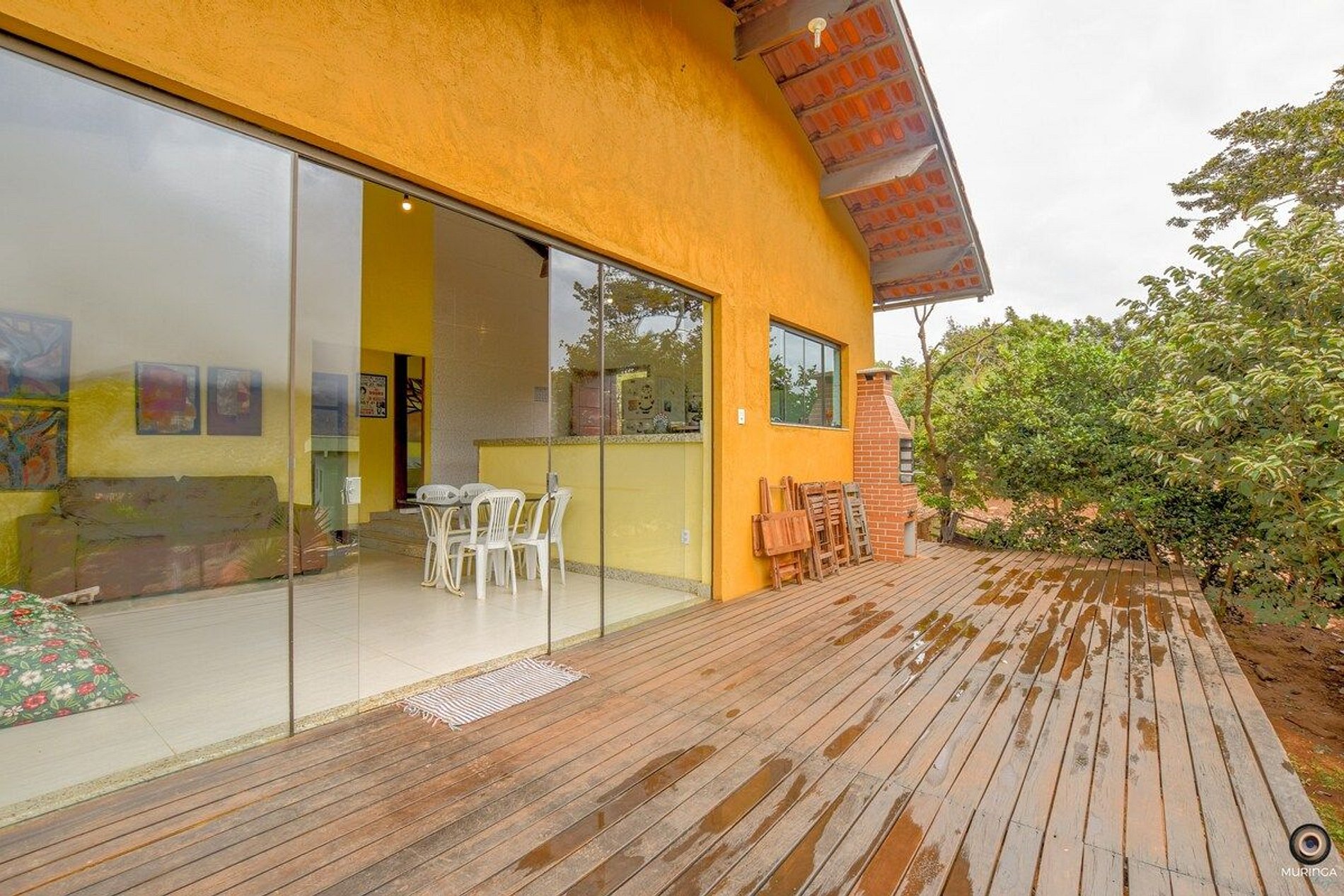 O chalé possui um deck com puff gigante, churrasqueira na lateral com uma vista linda da Lapinha!