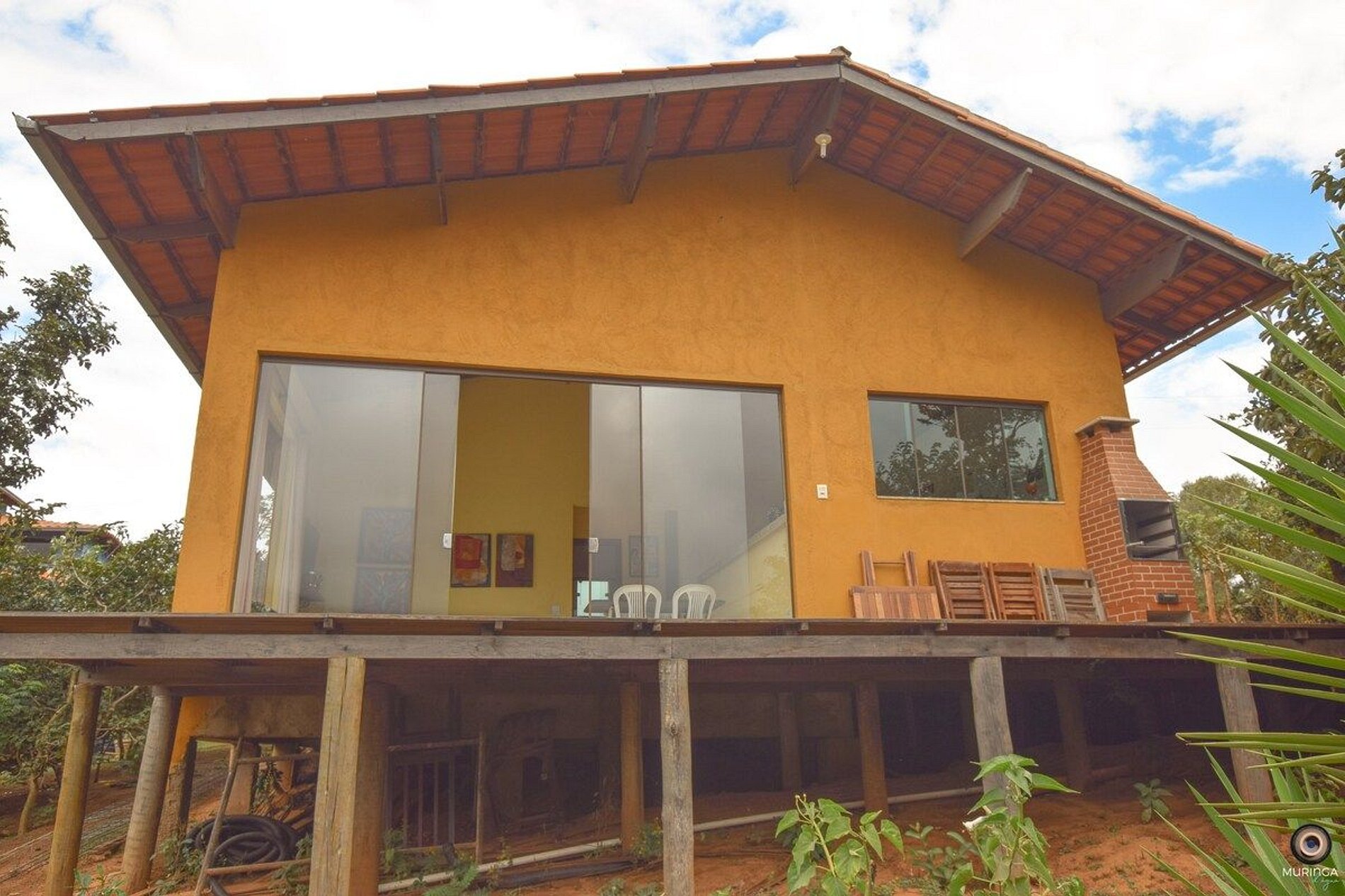 O chalé possui um deck com puff gigante, churrasqueira na lateral com uma vista linda da Lapinha!