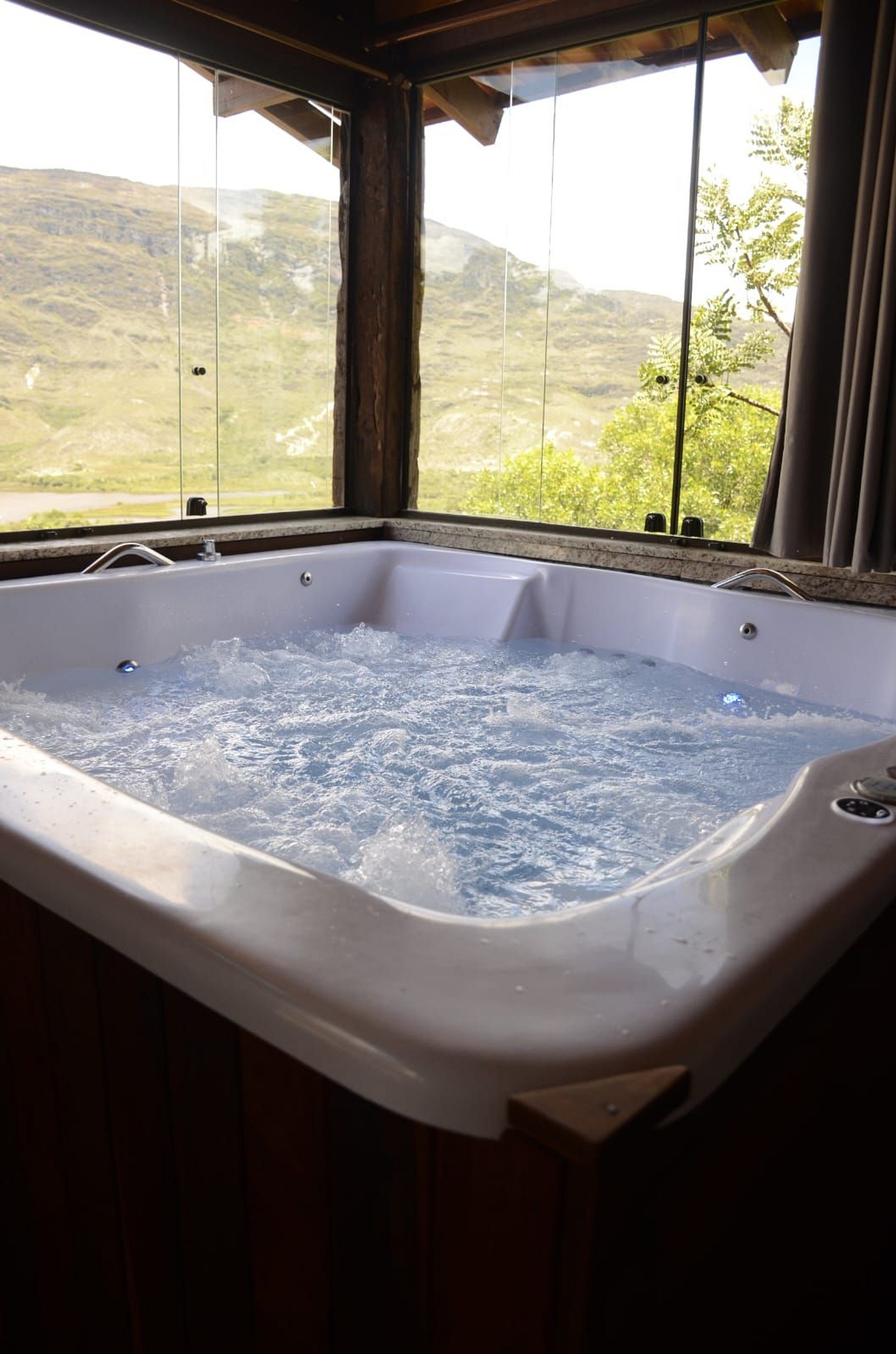 B) Chalé do Vaz - Chalé de 2 quartos com cozinha completa, roupas de cama e banho. Equipada com uma spa-hidro com capacidade de até 5 pessoas super confortável e com uma vista linda da Lapinha!